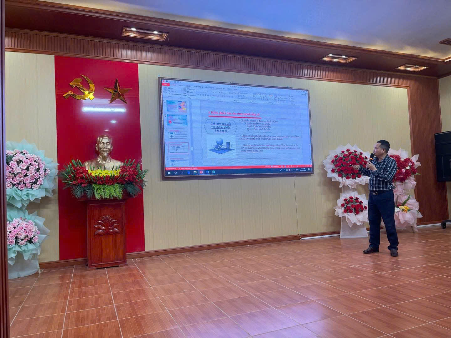 Đồng chí Phạm Đức Tài – Chuyên viên phòng Chính quyền địa phương Sở Nội Vụ hướng dẫn chi tiết quy trình, nghiệp vụ thực hiện công tác bầu cử tại hội nghị