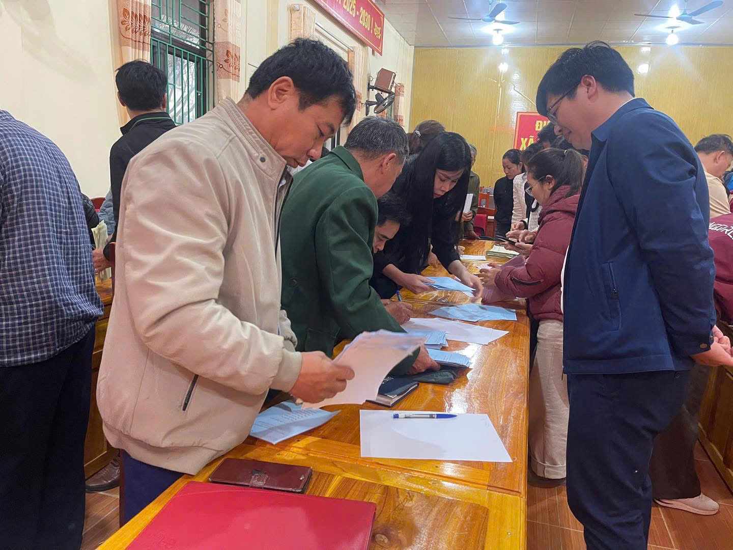 Đồng chí Nguyễn Anh Đức, Bí thư Đảng uỷ, Chủ tịch HĐND xã, Trưởng ban chỉ đạo Bầu cử xã theo dõi các thành viên tổ bầu cử thực hành kiểm phiếu và tổng hợp phiếu bầu tại buổi tập huấn công tác bầu cử đại biểu Quốc hội khóa XVI và đại biểu HĐND các cấp nhiệm kỳ 2026 – 2031